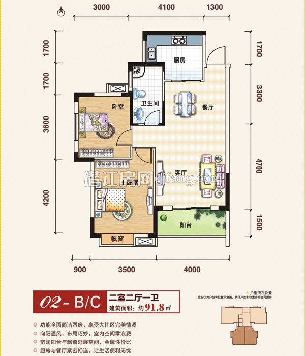 户型解析 ·功能全面简洁两房,享受大社区情调 ·向阳通风,布局巧妙,室内空间零浪费 ·宽阔阳台与飘窗延展空间,性价比 ·厨房与餐厅紧密相连,让生活便利无忧
