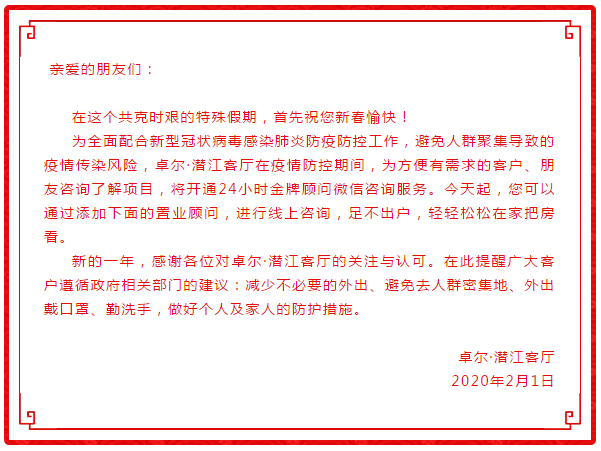为全面配合新型冠状病毒感染肺炎防疫防控工作,避免人群聚集导致的疫情传染风险,卓尔·潜江客厅在疫情防控期间,为方便有需求的客户、朋友咨询了解项目,将开通24小时金牌顾问微信咨询服务。今天起,您可以通过添加下面的置业顾问,进行线上咨询,足不出户,轻轻松松在家把房看。...[阅读全文]