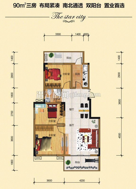户型解析 【客/餐厅】我喜欢这样餐厅、客厅连成一线的设计,妙的是在90㎡的空间里也可以享受; 【厨房】宽敞的厨房,还配有大生活阳台,再也不用担心厨房一团糟; 【主卧】每一个早晨,阳光都从南面倾泻而下,开启美好的; 【阳台】连接客厅的朝南大阳台,纳景于室,让心情与风景一起飞扬。