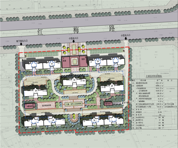 从规划设计来看,整个项目共计7栋17F高层组成,靠红梅路设有两个小区出入口和一个地库出入口。
