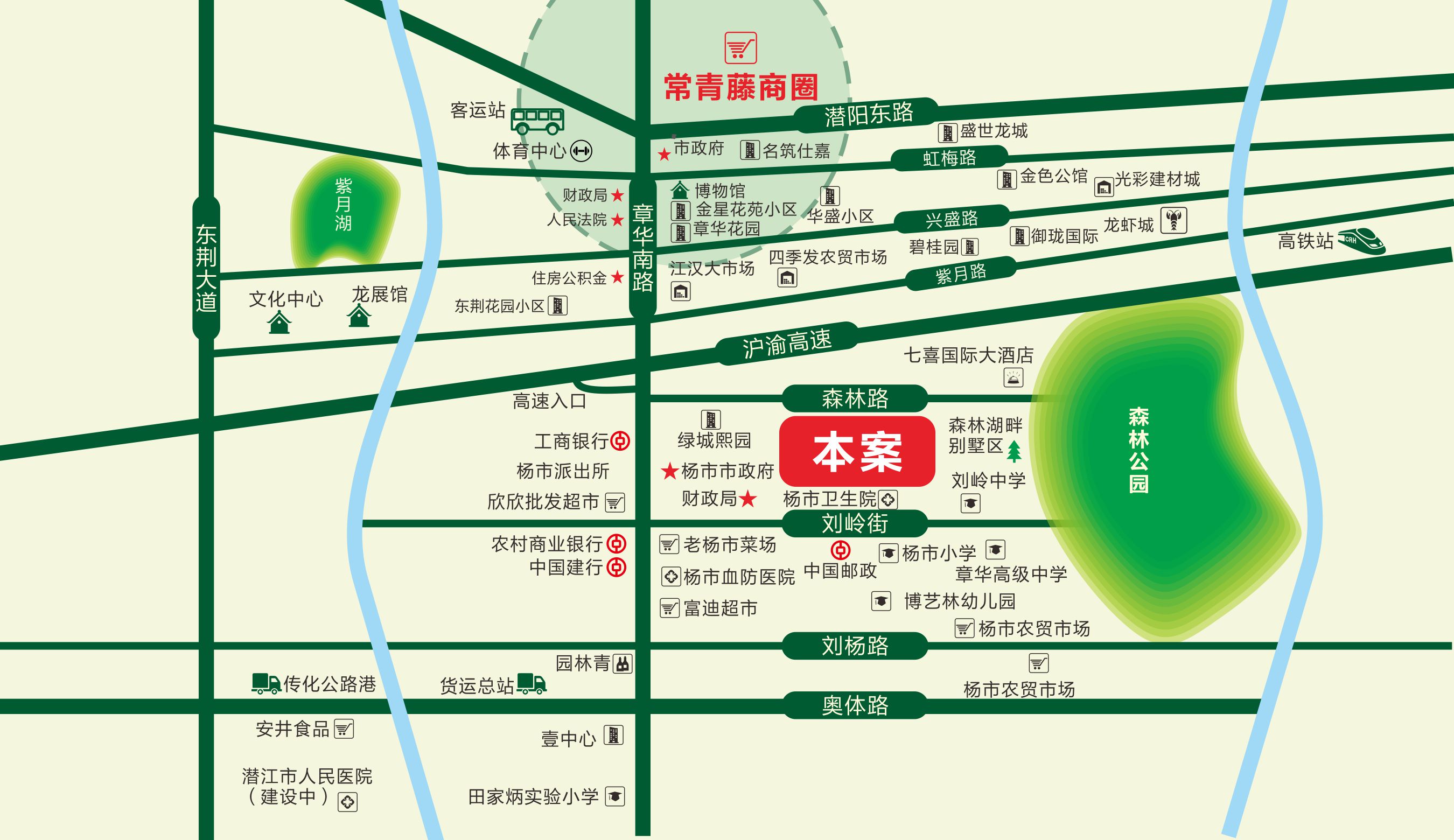 项目位于潜江市杨市森林大道100米处,总占地面积约34874平方米,由2栋17F(底层架空)、6栋20F(其中4栋底层架空)高层组成,规划总户数560户。属城市潜力区域,1公里范围内博艺灵幼儿园、杨市小学、刘岭中学、章华高中、杨市农贸市场、富迪超市等,教育、医疗、商业、休闲配套等齐聚,且周边板块醇熟,居住氛围浓厚。