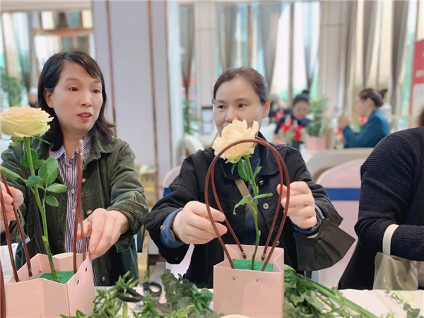 在花艺老师的专业指导下,大家纷纷变身“插花大师”,发挥自己的奇思妙想。一朵朵美丽的鲜花枝叶在大家的手中被赋予新的生命,经过精心的修剪与搭配,原本普通的花叶、枝条变成了色彩斑斓、独具匠心的花艺作品。