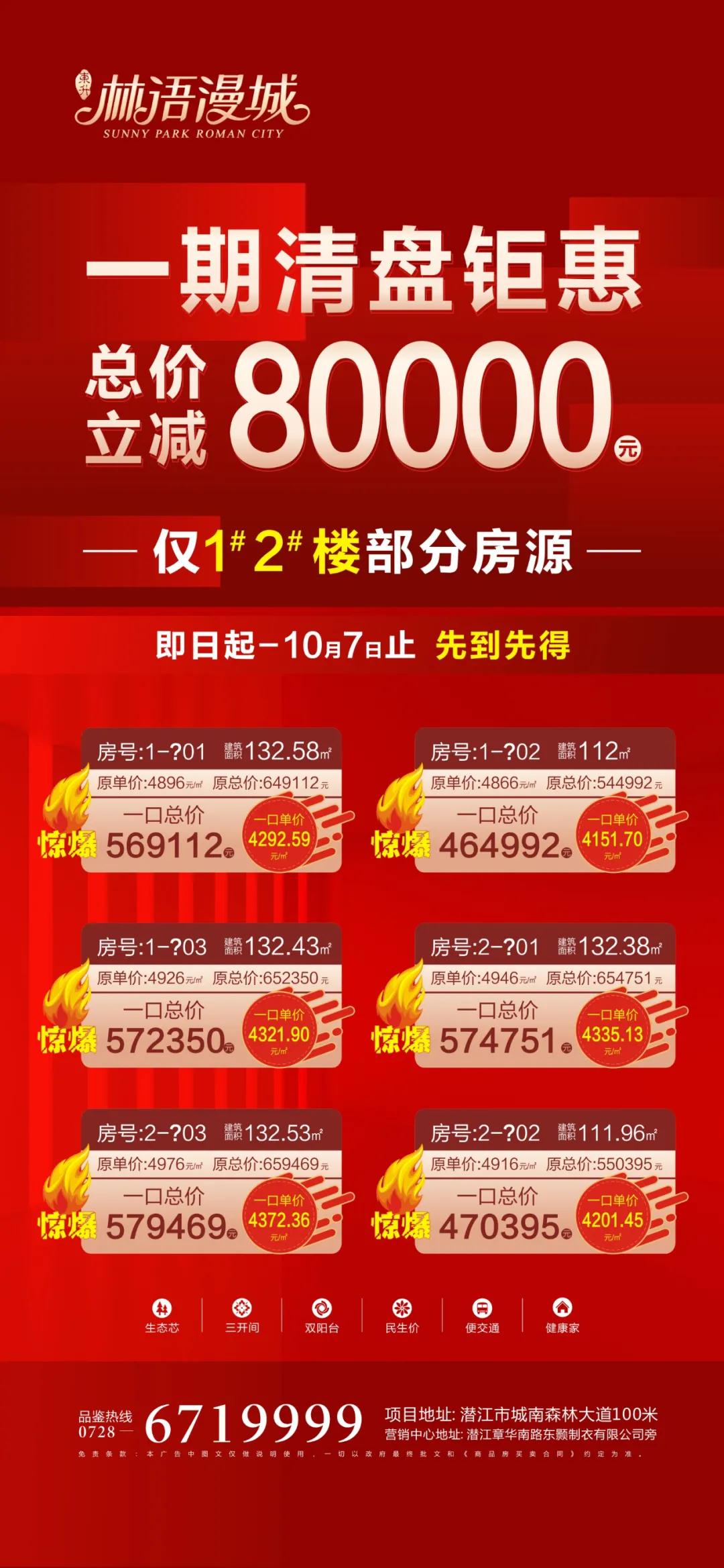 东升·林语漫城一期进入清盘阶段,购买一期1#、2#楼部分房源,可享总价减80000元的优惠。