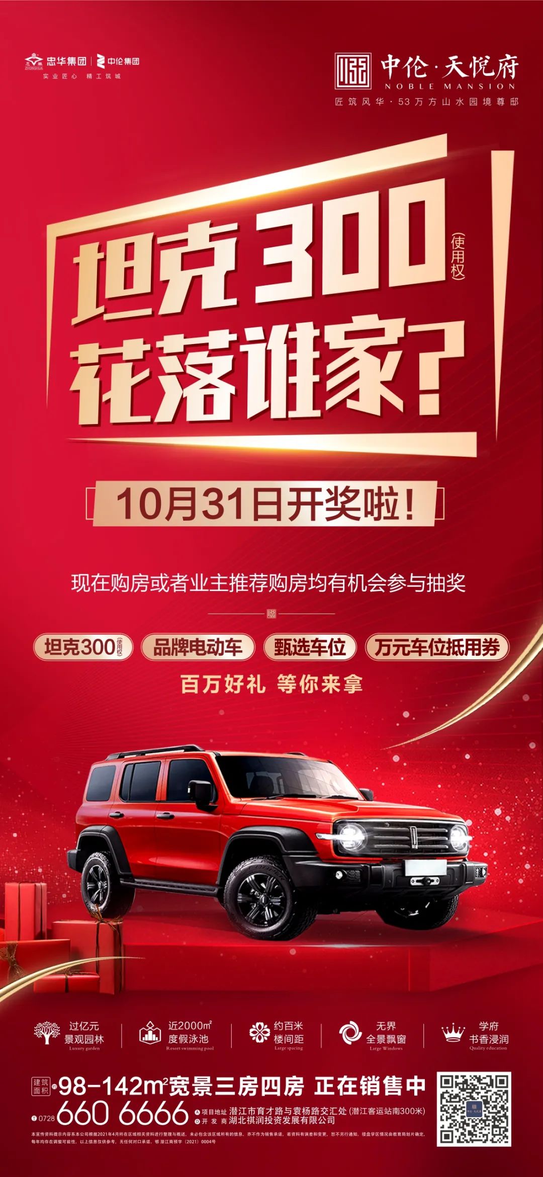 奖品数量:坦克300一辆;车位5个(原价5.8万,优惠价3.8万/个);电动车10辆;车位抵用券60张。