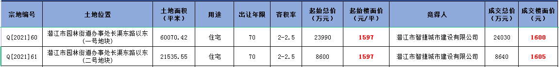 11月30日土拍结果出炉!潜江市智捷城市建设有限公司成功竞得潜江主城区Q[2021]60和Q[2021]61地块。Q[2021]60地块成交价24030万元,楼面价1600元/㎡,溢价率:0.17%;Q[2021]61地块成交价8640万元,楼面地价1605元/㎡,溢价率:0.47%。