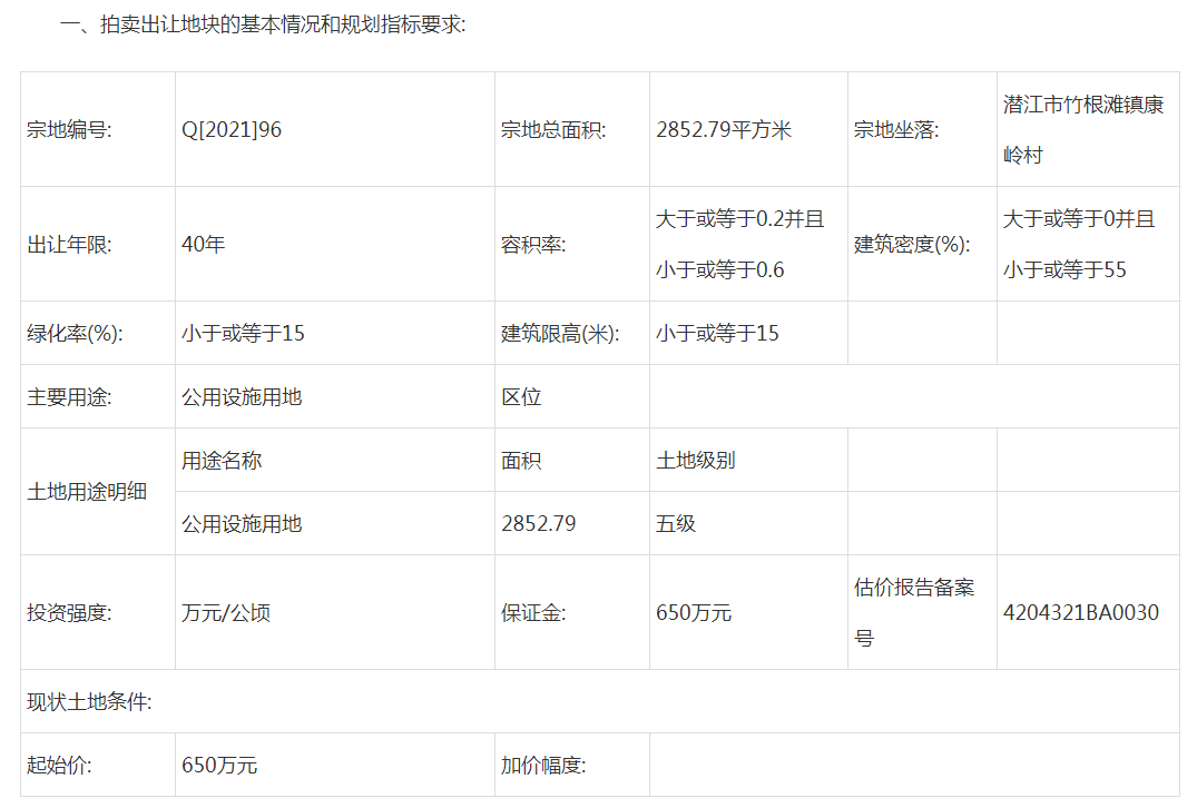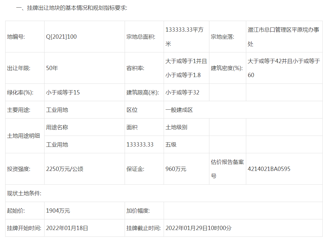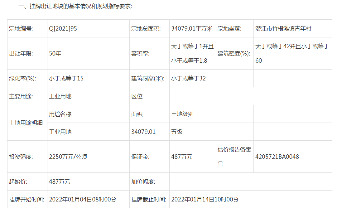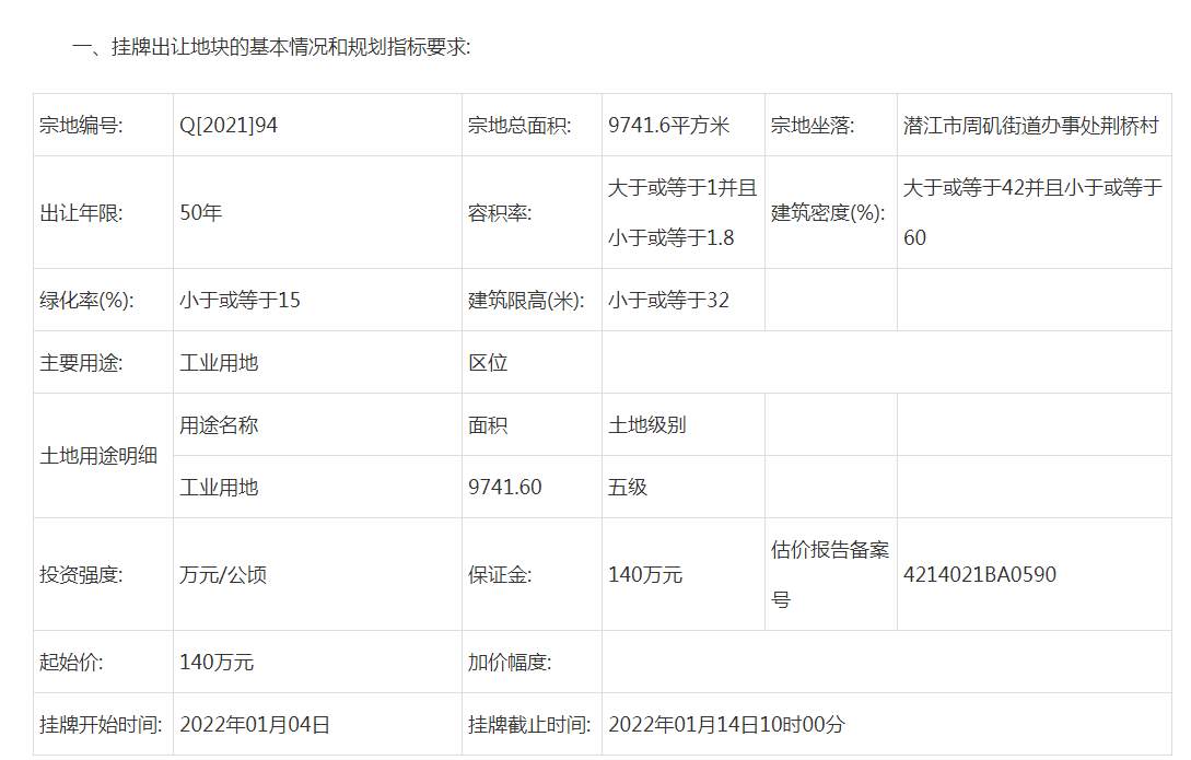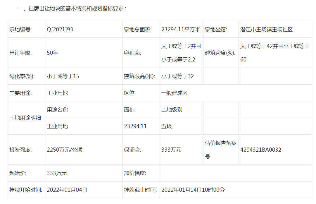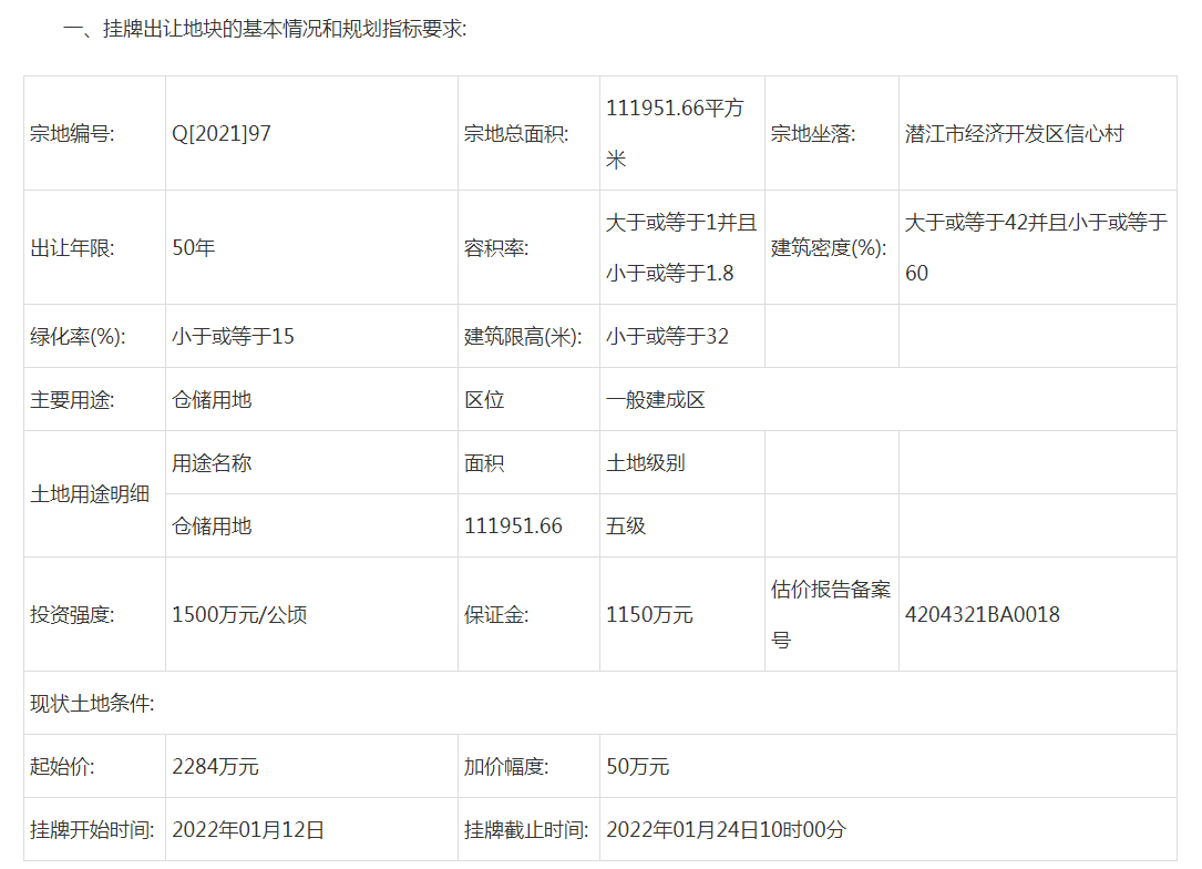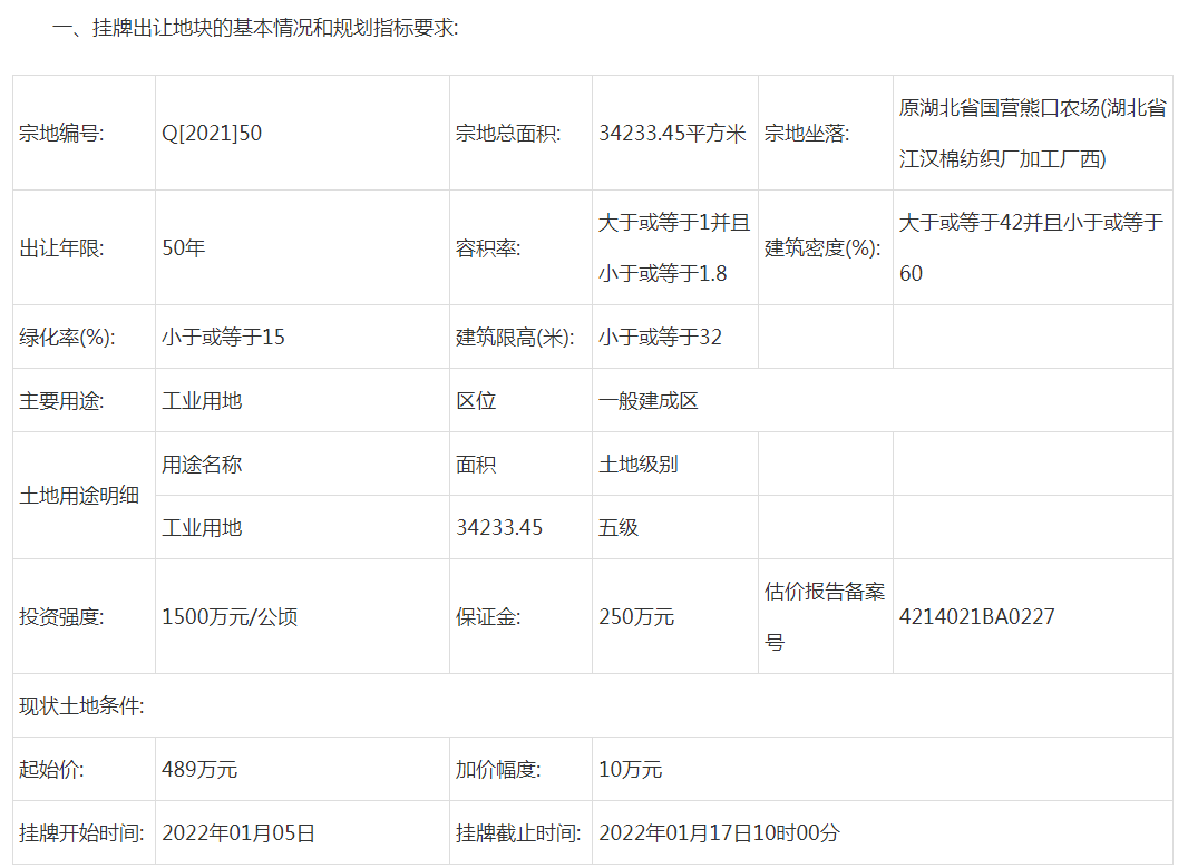 据潜江房网统计:截止2021年12月31日,2022年1月份潜江预计出让8宗土地,其中6宗为工业用地、1宗为商业用地、1宗为公共设施用地。总面积约433822.4㎡,总金额约6287万元,其中不包含Q[2021]98号宗地起始价。