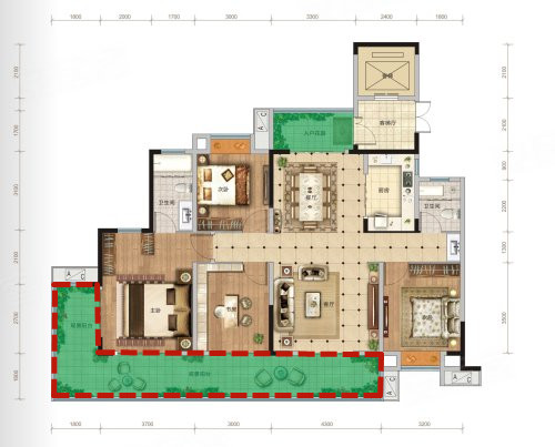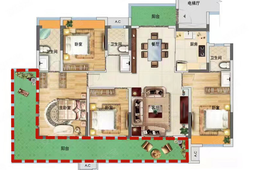大“L”形阳台设计,270°景观面,由大落地窗的横厅延展出的大阳台,大阳台体现出来的大气人生,同时也是高品质住宅的标配。同时,为了保证私密性,套房设计,主卧空间尺度都能满足主人需求。