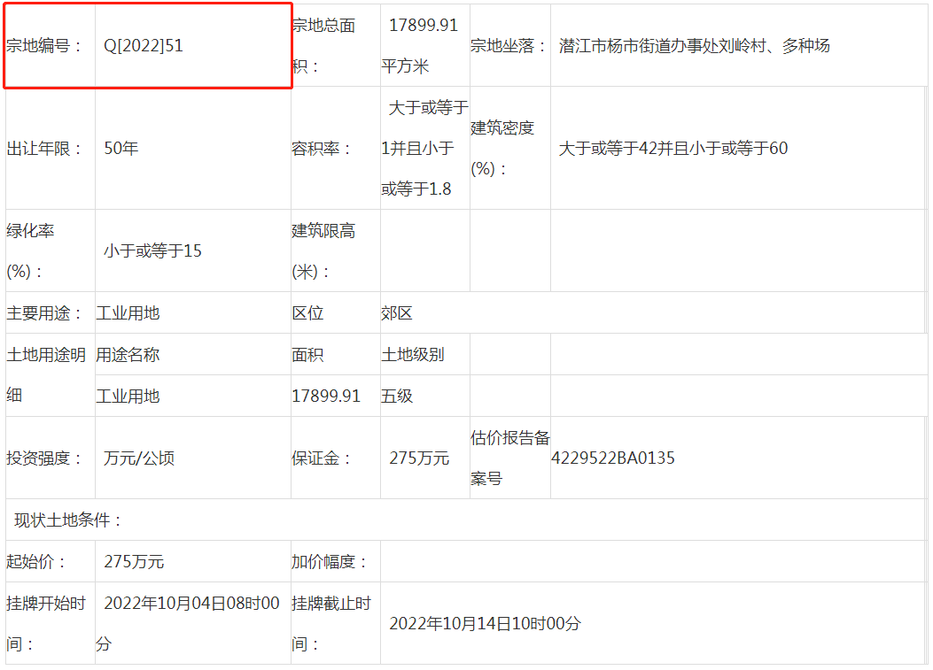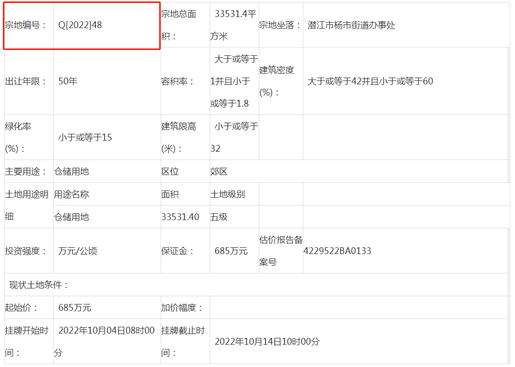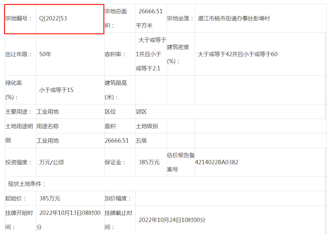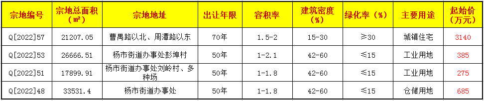 Q[2022]53宗地位于杨市办事处彭埠村,宗地总面积26666.51㎡,出让年限50年,土地用途为工业用地,起始价385万元。Q[2022]51地块总面积17899.91㎡,同样也是作为工业用地挂牌出让,Q[2022]48地块作为仓储用地挂牌。