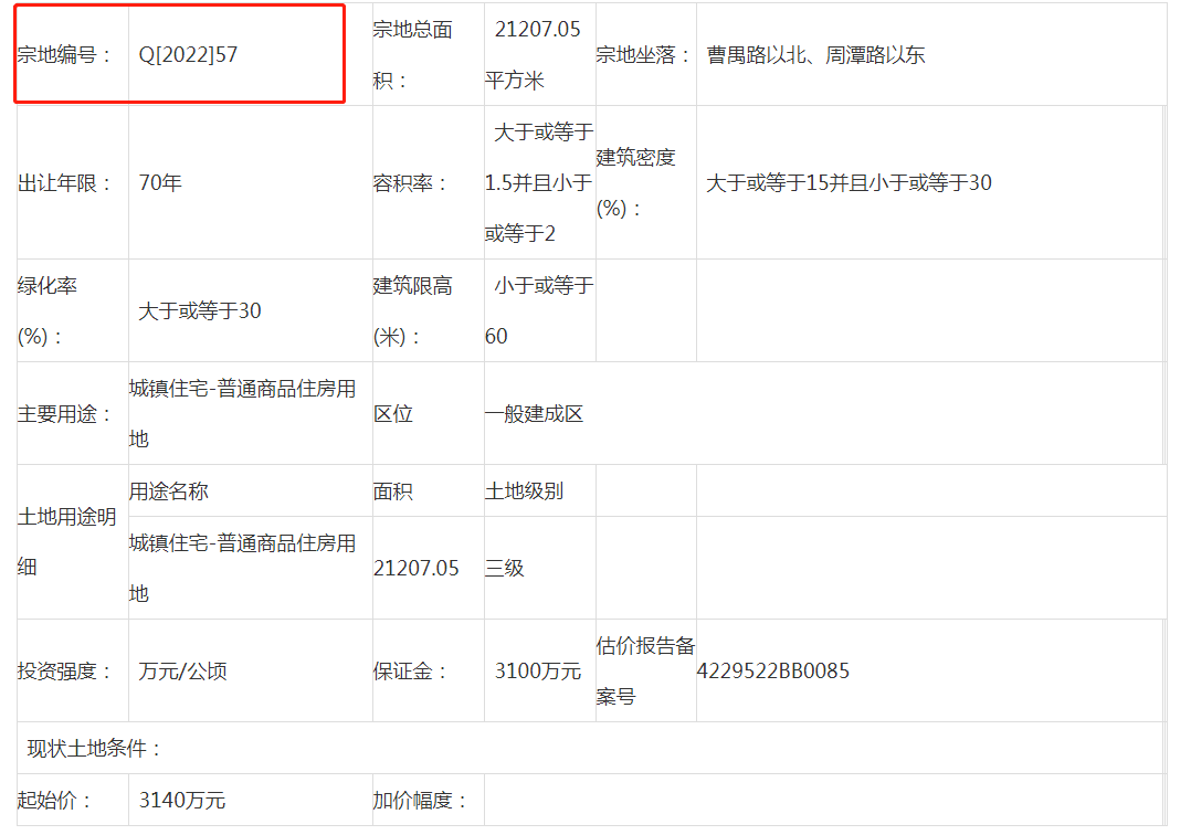 该地块位于潜江城区,曹禺路以北、周潭路以东,作为城镇住宅用地,老城区的区位、配套等优势明显。本次挂牌宗地面积21207.005㎡,起始价3140万元,保证金3100万元,楼面价740.32元/㎡。