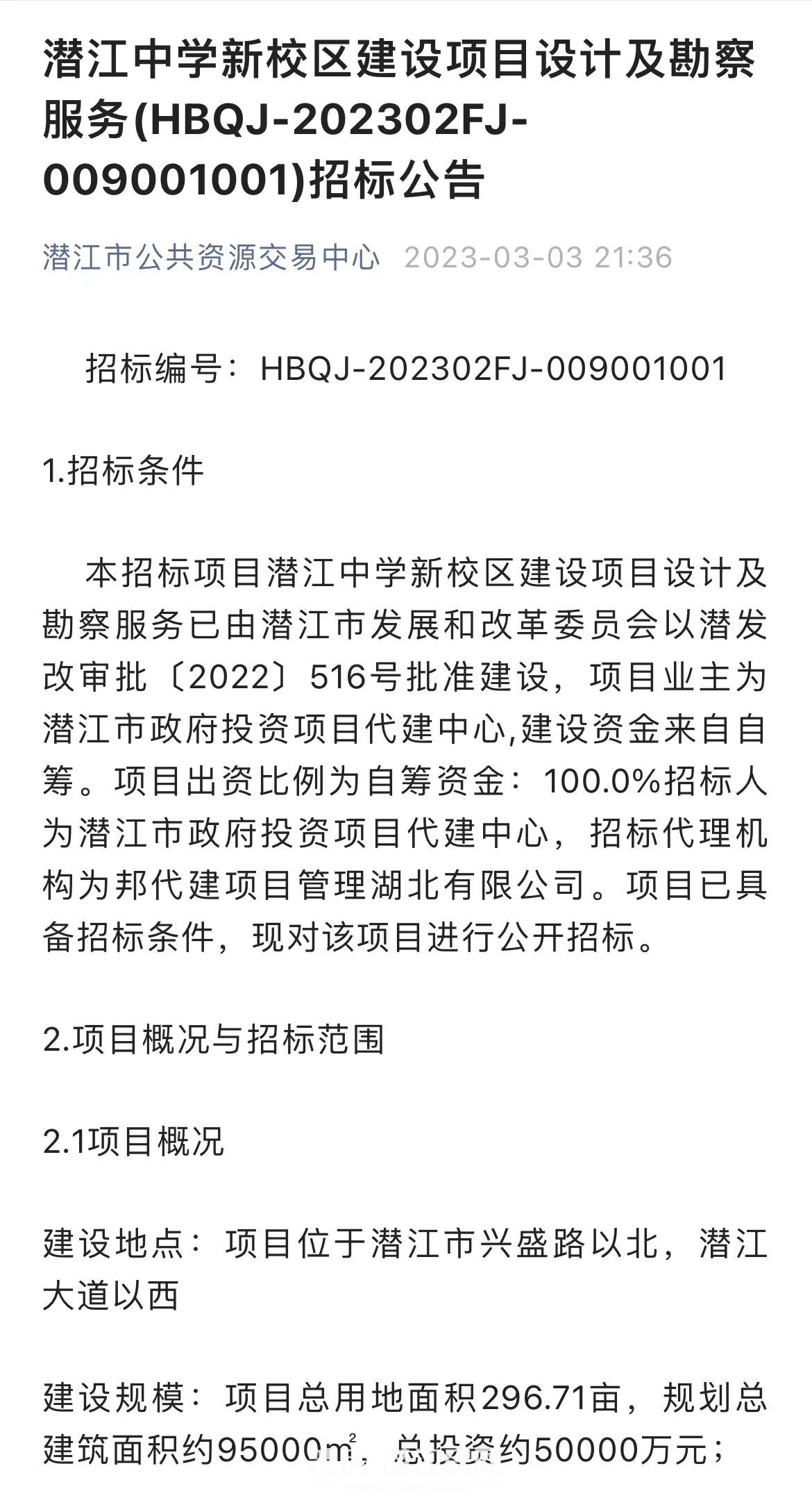 根据公告可知,潜江中学新校区选址位于潜江市兴盛路以北,潜江大道以西,项目总用地面积296.71亩,规划总建筑面积约95000㎡,总投资约50000万元。
