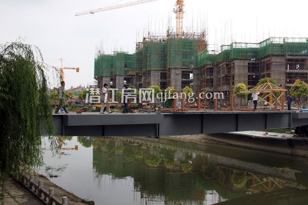 项目主入口“阳光桥”正在搭建桥面,桥的两端会建4个凉亭,目前正在紧张施工中。项目对面的地上停车场总面积5000㎡,停车面积为2400㎡,停车位500个,其余的则是绿化休闲广场,将来业主在茶余饭后的休闲好去处。