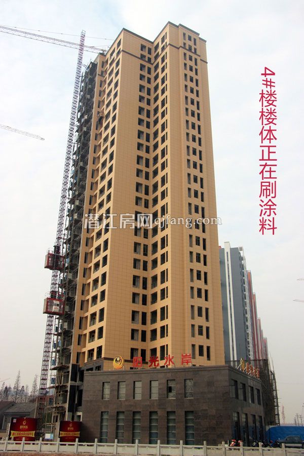 阳光水岸4#楼共25层,楼体正在刷涂料;3#楼共31层,主体结构已完工,正在做内墙隔断;2#楼共31层,已建设至28层;1#楼共31层,已建设至7层。
