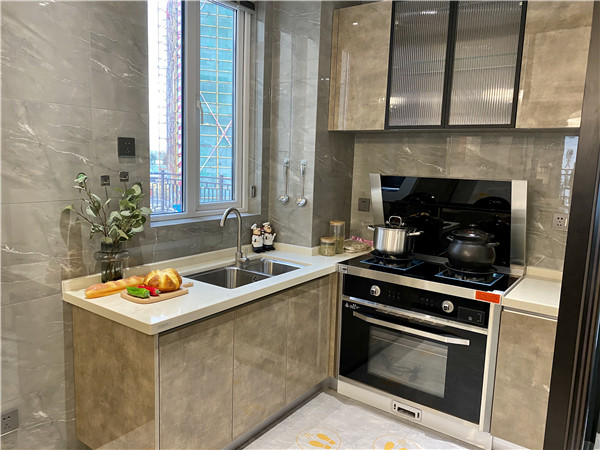 L型厨房设计,空间动线合理,“洗、切、炒、取”轻松流畅,3米进深让烹饪不再拘泥于狭小空间,布局更合理,视野更开阔,让烹饪成为一种享受,烹调美味生活。