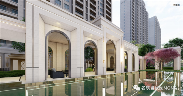 拾级而上,便是镜水迎宾,名筑当代阅ΜΟΜΛ采用大片开阔的镜面水景烘托景观长廊建筑,规则式的大水景与长廊空间形成鲜明的对比,欲扬先抑,带来心灵的震撼。