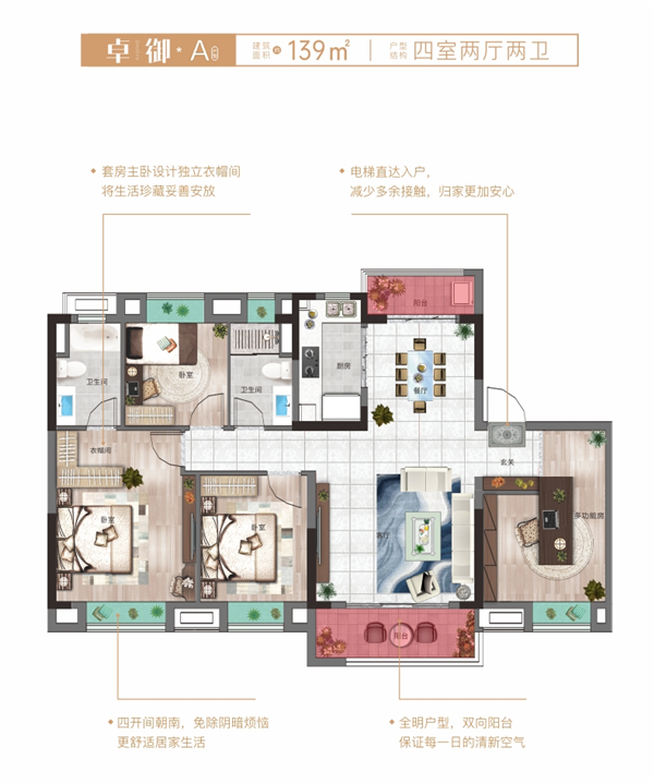 卓尔·潜江客厅8#楼户型方面,主推140㎡四室两厅两卫,电梯直达入户,减少多余接触,让归家路途更加安心;套房主卧设计独立衣帽间,将生活美好妥善安放;四开间朝南,免除阴暗烦恼,更合适居家生活;全明户型,双向阳台,保证每一日的清新空气。