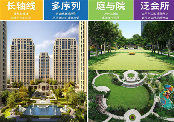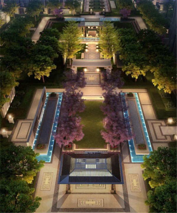 【卓尔·潜江客厅】的园林构造传承“规则式尊贵轴线空间”同时融入“现代自然院落花园”,打造不同层级空间。