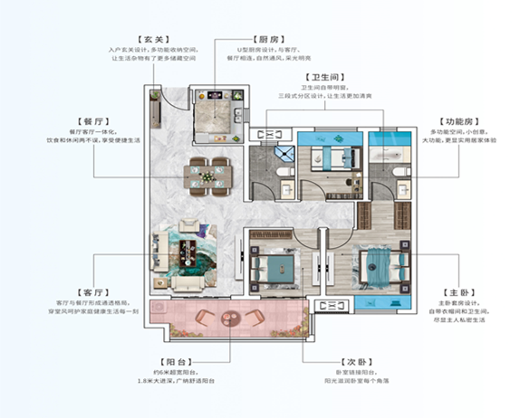 餐客一体的设计,形成更大的空间感。更值得一提的是,98㎡户型竟配备奢宅才有的6米双联大阳台,延展室内空间,做一个简单的分区,可以为自己划设一个阳台休闲区,种一些绿植,丢一个懒人沙发过去,美哉美哉。