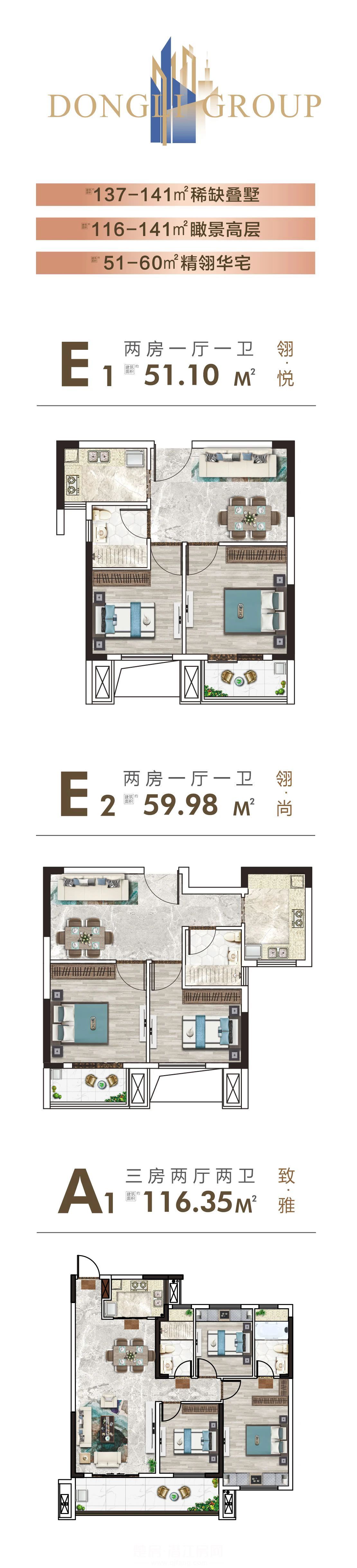 东立壹品建面约137-141m²稀缺叠墅、建面约116-141m²瞰景高层正在前期咨询中,更有特色户型——建面约51-60m²精翎华宅等您品鉴。在东立壹品,您想要的户型,我们都有!