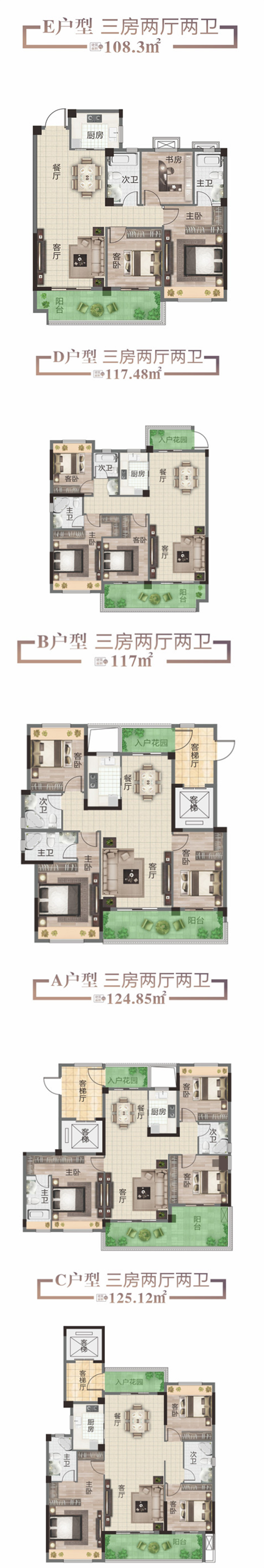 繁华城芯,让生活更精彩!项目共分为约108.3㎡3房2厅2卫、约117㎡3房2厅2卫、约117.48㎡3房2厅2卫、约124.85㎡3房2厅2卫、约125.12㎡3房2厅2卫五种户型,毛坯交付,整体以刚需+首改的客群为主。