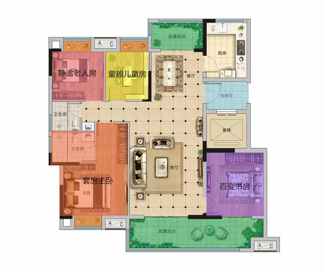 整体采用动静分离的布局,即使在客厅会客,亦不影响老人在房间休息。四房设计更符合同住需求,儿童房可选择临近主卧对面的侧卧,方便家长照顾孩子起居,而老人房可选与卫生间相邻的北向里侧次卧,方便老人夜起。