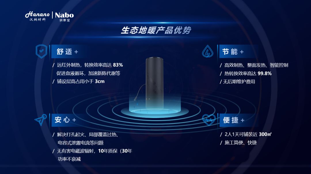 项目所赠送地暖为Nabo“纳康宝”生态地暖,Nabo“纳康宝”是汉纳材料旗下的科学采暖品牌,专注于研制新型采暖材料——CNTs碳纳米管发热膜,应用于民用采暖市场,一举解决了电采暖产品的用电安全问题、电磁辐射问题、功率衰减问题及高能耗问题。
