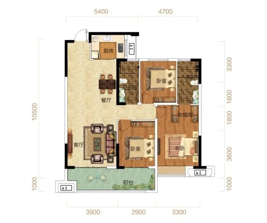 建面约118㎡三室两厅两卫户型
