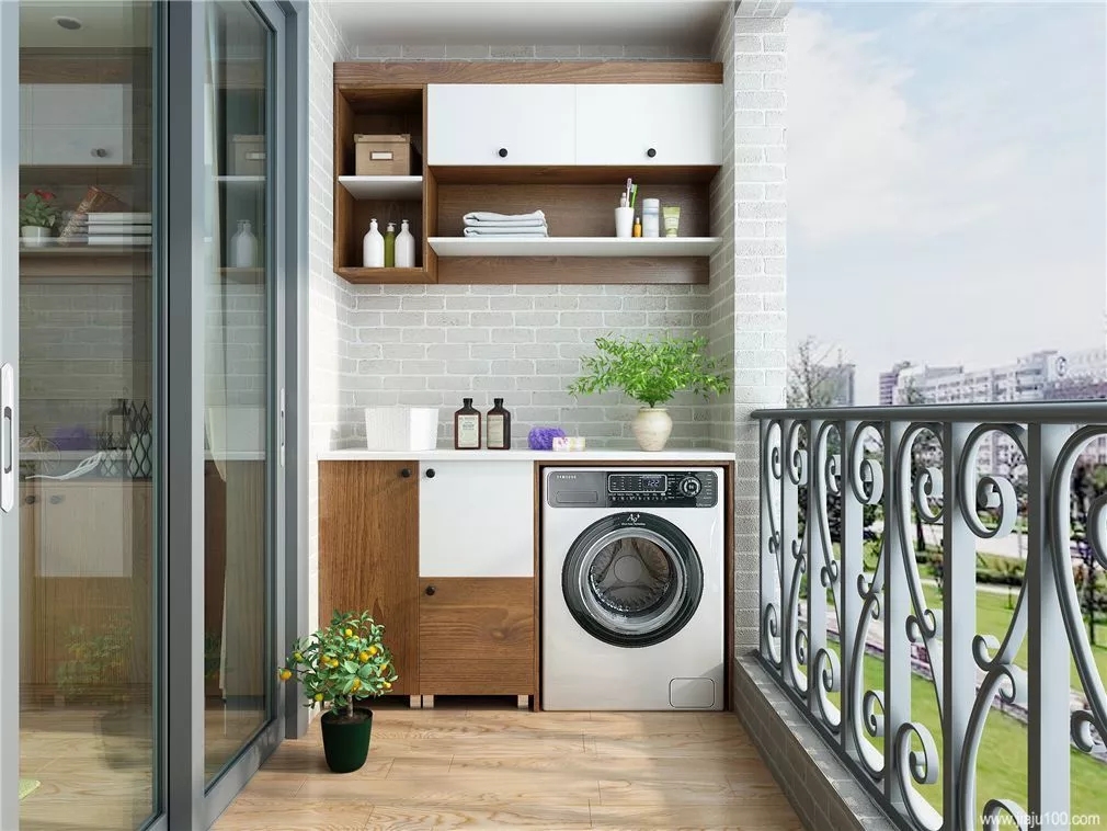 太多东西没有多余的地方放置,何不将阳台变作洗衣晾晒、储物一体的空间呢?洗衣机放浴室怕受潮,放阳台不仅晾晒方便,也节省了空间。还可以设计壁橱作为储物空间,物品不受潮。