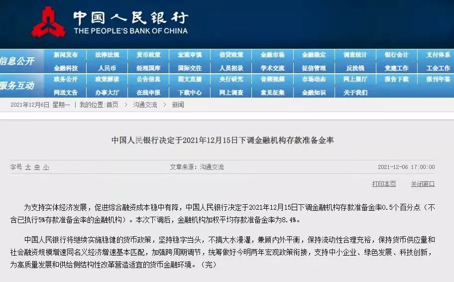 12月6日央行发布消息,宣布将在12月15日下调金融机构存款准备金率0.5个百分点(不含已执行5%存款准备金率的金融机构)。此次降准,将释放长期资金约1.2万亿元。