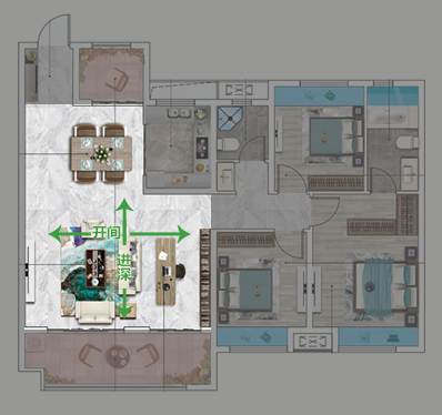 是指客厅和餐厅横向相连,即开间大于进深,且都在同一采光面上。
