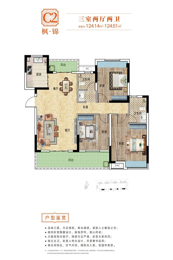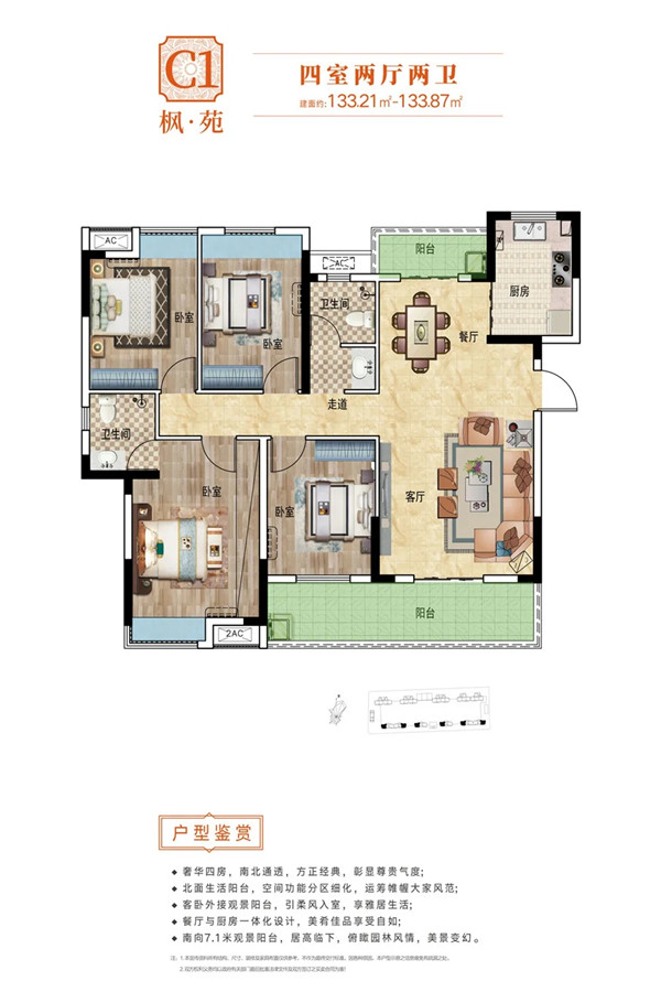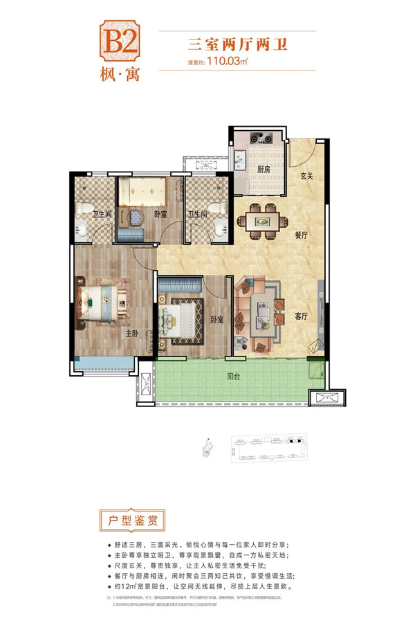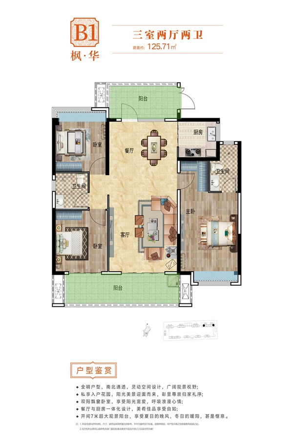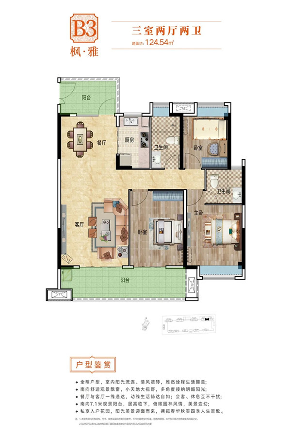 小区采用阶梯式排布,照顾每一户居者的光照及观景体验,南低北高,阳光无遮挡。南向为11层花园洋房,其三开间朝南,南北双阳台,约7㎡入户花园,推门即景;南向约13m宽幕双景阳台,阳光入室内,南北通透、功能分区明确,充分考量采光、私密、视野等细节。