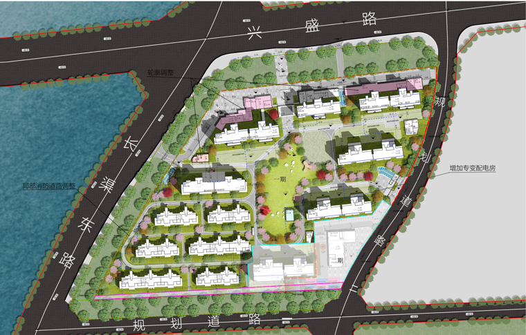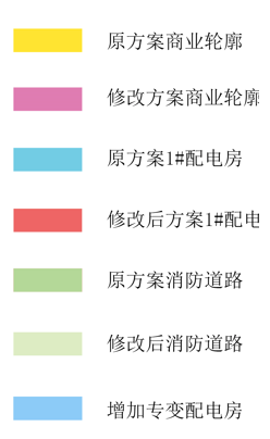 1.调整范围:商业轮廓调整;1#配电房轮廓调整;局部消防道路调整;增加专变配电房。