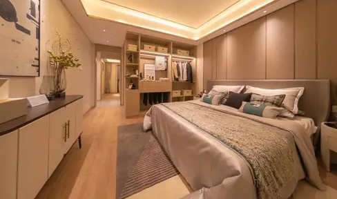 主卧套间设计, 私属天地,浪漫生活。配备衣帽间、梳妆台满足了每个女生对婚后生活的向往,同时浪漫的飘窗,更是让清风与阳光相伴,在这里,每一处细节都是对浪漫生活的保障。