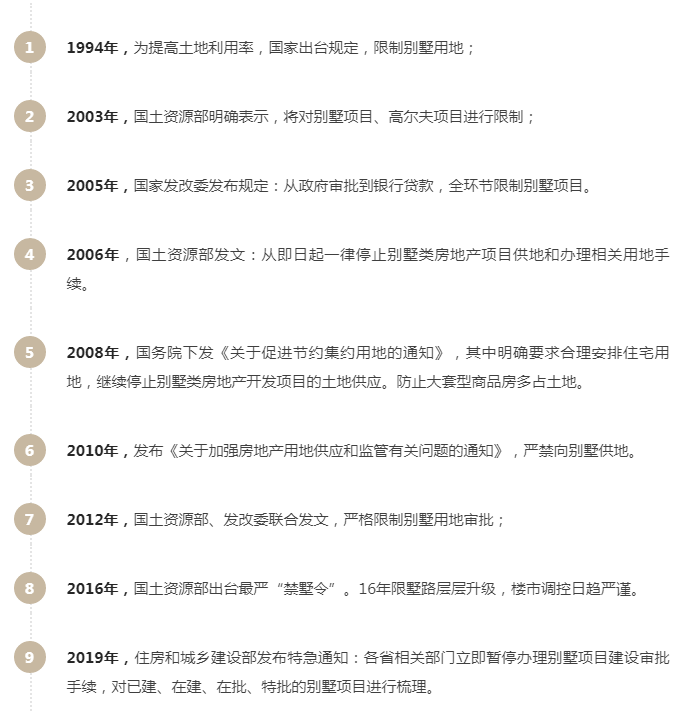 对于别墅的种种开发限制,可以追溯到上世纪90年代。20多年的限墅路层层升级,楼市调控日趋严谨。