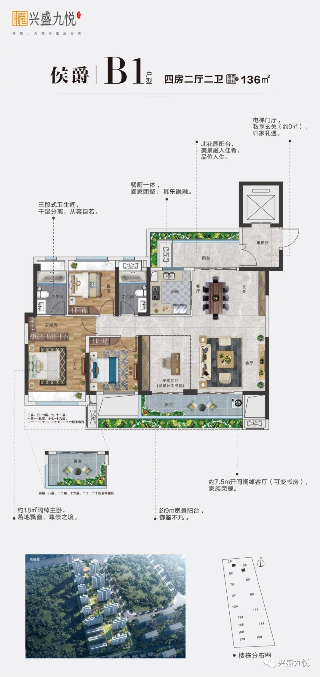 兴盛九悦项目将奢适、礼序、人文、生态融为一体,规划有152㎡低密叠墅、142㎡两梯两户大平层、136㎡超大面宽四房、126㎡超大面宽三房(可改四房)、111㎡精奢阳光三房。