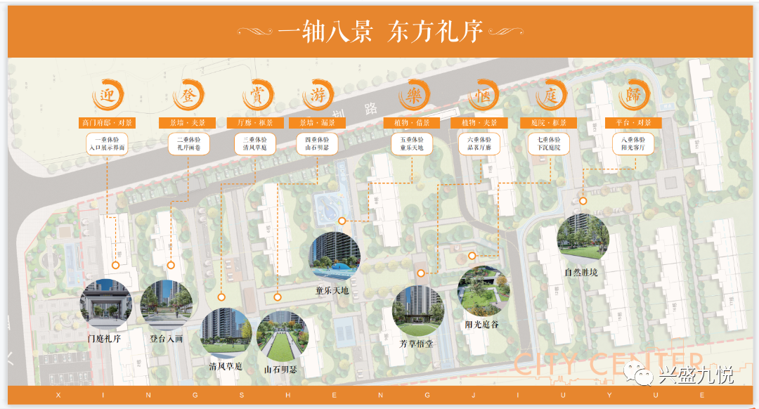 【一轴八景 东方礼序】社区内部景观面积达15000㎡,采用“一轴八景“的景观设计,分别为”迎、登、赏、游、乐、惬、庭、归“。层层递进,空间上的起承转合,建立起丰富独特而又环环相扣的参观体验, 传承东方礼序,打造城院府宅,创造高雅生活场所。