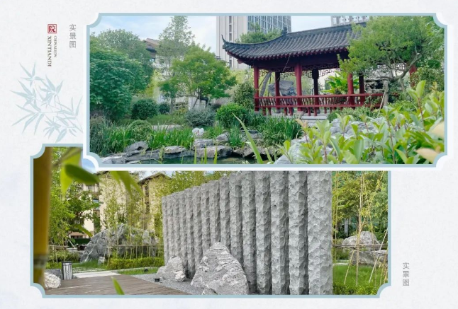 采用水、石、树、花、庭阁等景观意象