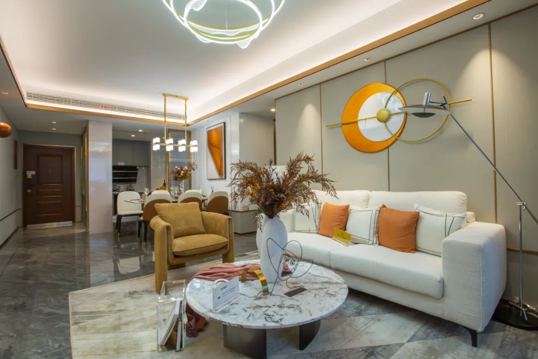 此外,客餐厅品牌瓷砖通铺、金属踢脚线、错层吊顶设计、高定版射灯、灯带环绕、岩板电视背景墙等设计,带来的不仅是朗阔的空间尺度、高阶的美学质感、赋予生活的享受,更是献给家庭生活的尊崇礼遇,是当之无愧的“门面担当”。
