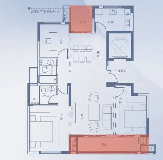 北向约5m²方正阳台,可变灵动空间,书房、后花园、麻将室;学习、娱乐、休闲........一切皆有可能。