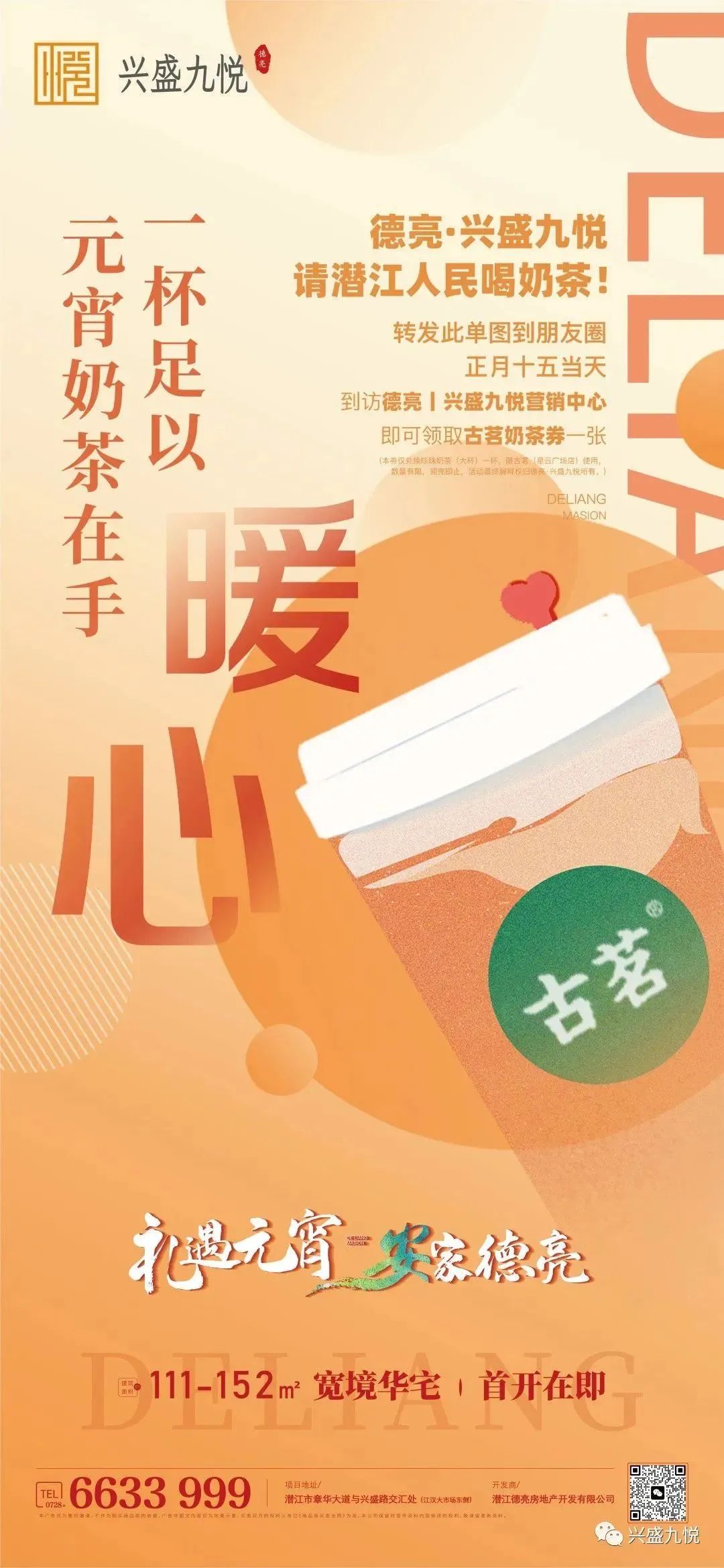 ★ 转发上面单图到朋友圈,2023年2月5日当天到访兴盛九悦营销中心登记,即可免费领取古茗奶茶券一张,不可代领,数量有限,送完即止;