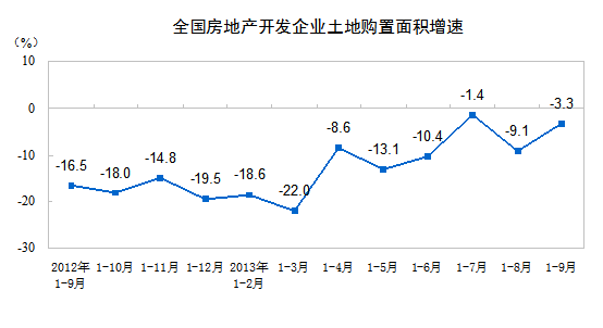 1-9月份,房地产开发企业土地购置面积25167万平方米,同比下降3.3%,降幅比1-8月份收窄5.8个百分点;土地成交价款6082亿元,增长14.6%,增速提高9.4个百分点。
