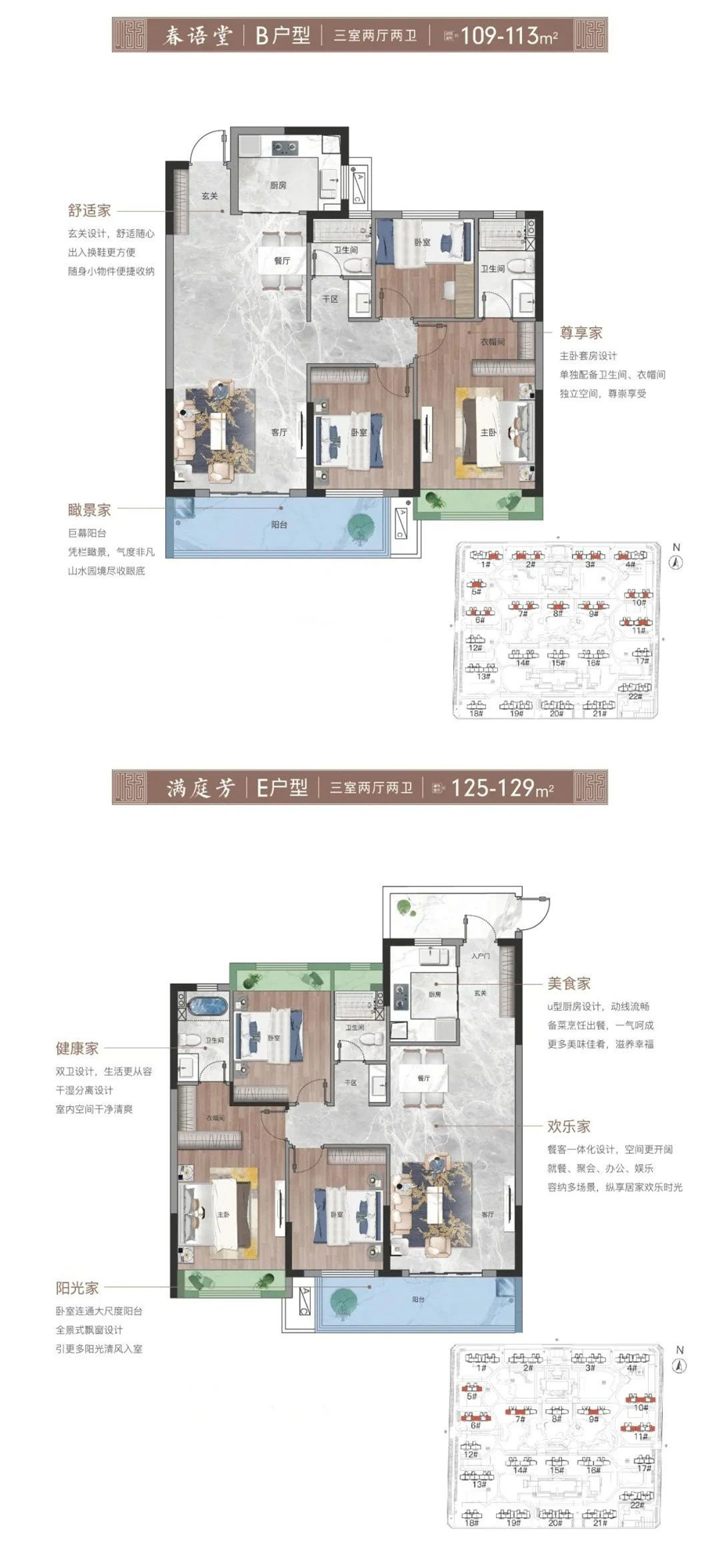九月获得预售的楼栋为5#楼和9#楼,其中5#楼为27层的高层,户型有建面约116.92m²的三室两厅两卫、建面约125.21m²的四室两厅两卫和建面约139.24m²的四室两厅两卫,共计104套;9#楼为6层的多层叠墅,共24套。项目在售楼栋中,一期3#楼、4#楼目前已经售罄,2#楼建面约51-58m²两室一厅一卫还有少量在售。部分户型图如下:
