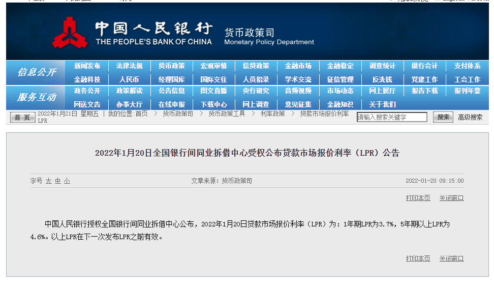 昨天,中国人民银行授权全国银行间同业拆借中心公布,1月20日贷款市场报价利率,也就是LPR为:1年期LPR为3.7%,下调10个基点;5年期以上LPR为4.6%,下调5个基点。这是5年期以上LPR自2020年4月以来的首次下调。