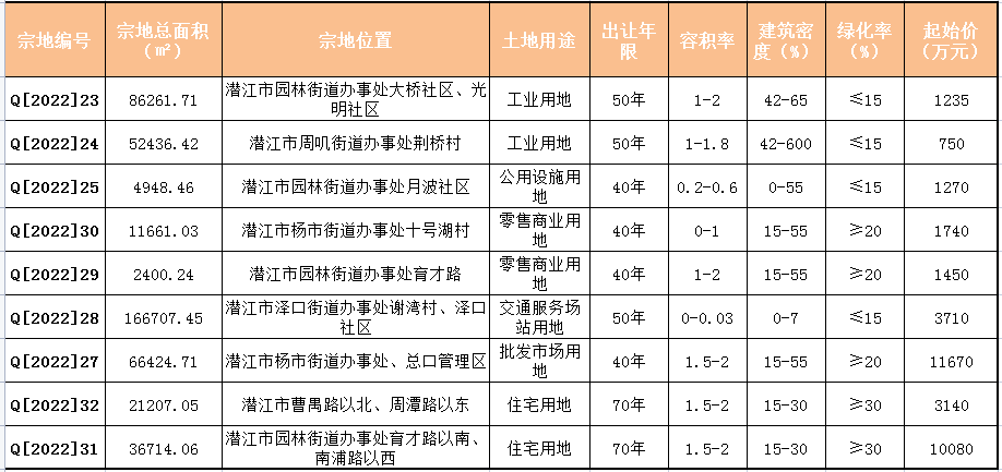 据潜江市人民政府数据统计,2022年6月预计共有9宗地块出让,总出让面积448761.13㎡,总起始价35045万元!