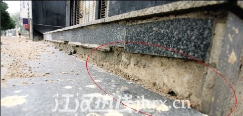 该小区东挨武金堤、西临长江。昨日,记者在该小区发现,小区临街面——33栋、34栋商铺地面多处出现沉降裂缝,多处门面入口处的台阶均出现不同程度下沉,沉降严重处有20厘米,街面大理石承重柱底部也因沉降与门面台阶底部断开。