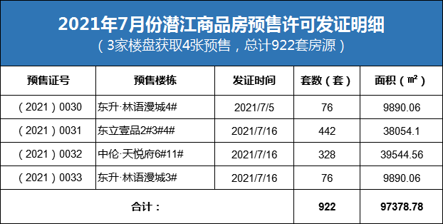 截止2021年7月21日,潜江市住建局共公布了4张商品房预售许可证,涉及3个楼盘,分别是东升·林语漫城、中伦·天悦府、东立壹品,住宅总预售房源922套,总预售面积97378.78㎡。