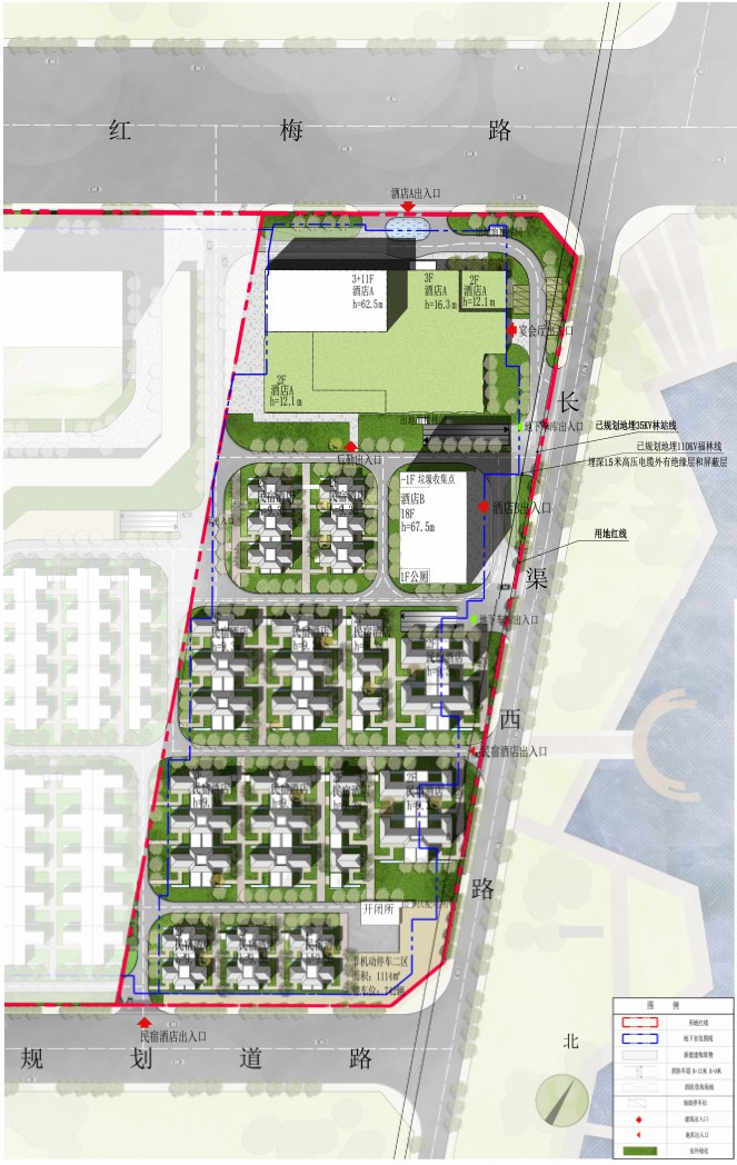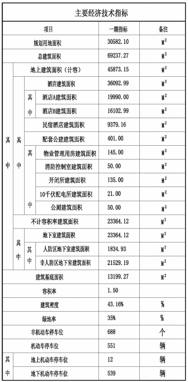此次规划项目位于红梅路与长渠西路交汇处,一期规划用地面积为30582.10㎡;总建筑面积为69237.27㎡,计容积建筑面积为45973.15㎡,含36092.99㎡的五星级酒店、9379.16㎡的民宿酒店和401.00㎡的配套用房。具体可见下表: